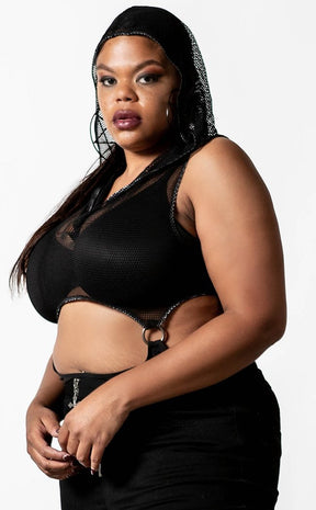 Be your fiercest self in the Hellen bodysuit! The body-hugging fit splits between a hooded fishnet upper with a plunging neckline and an opaque bottom. The two sections connect with straps and D rings, leaving a sexy cutout at the waist.