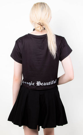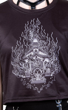 Dance in the hell flames with the Holy Smokes Crop Tee! Get comfy creepy in super soft fabric as black as your soul, printed with wicked artwork of a burning church as well as the Tragic Beautiful logo on the back. This crop is cut to the perfect length, sitting at your natural waistline and stretches with you for a comfortable, flattering fit.