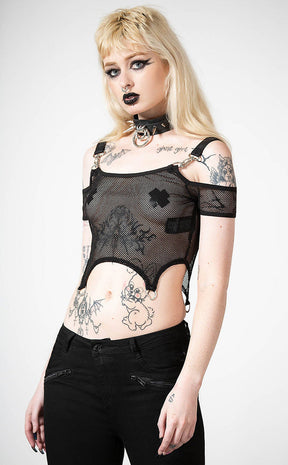 Add a punk edge to yer wardrobe with the Hurricane Fishnet Crop Top! Soft, stretch fishnet forms this bardot style crop, featuring statement buckled straps and D rings.