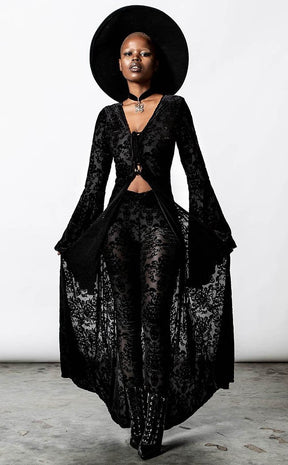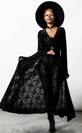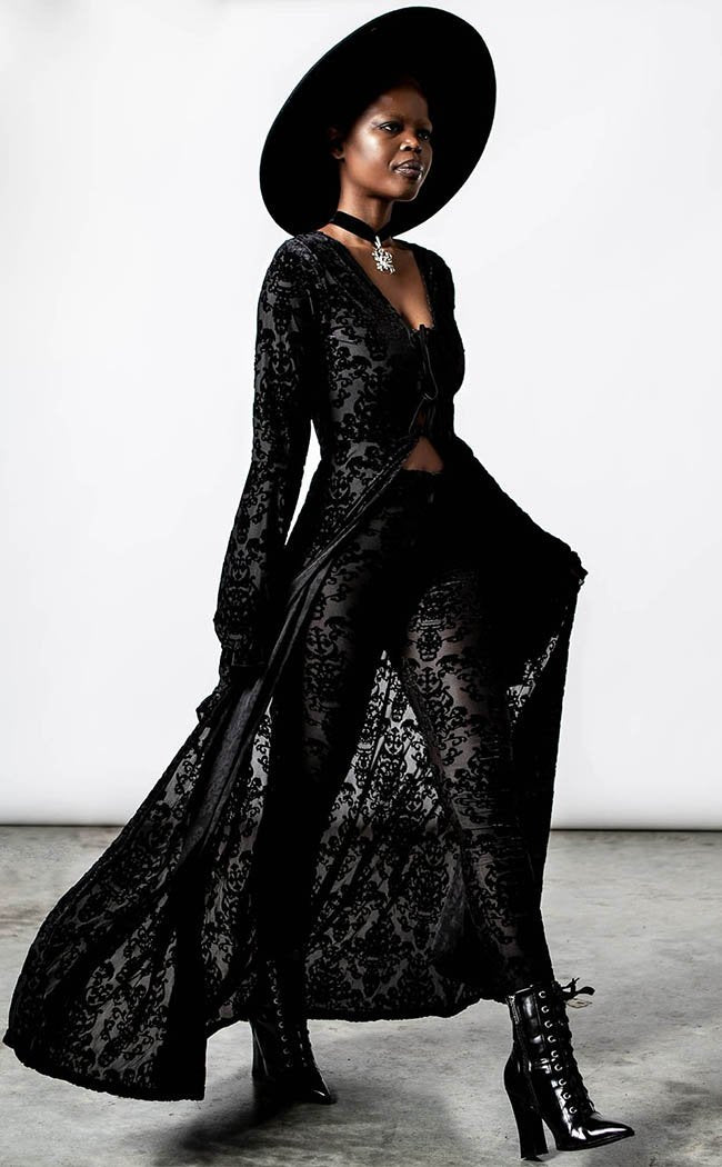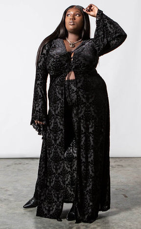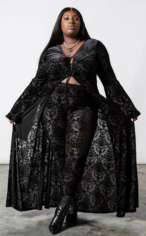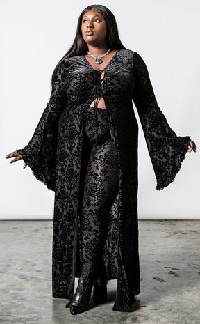 Dress with all of the drama and glamour you deserve! The Inferno Velvet duster is made with Killstar's iconic soft, stretch velvet, finished with a gorgeous burnout pattern that flows down your curves. The tie front detail and bell sleeves add seductive retro vibes while the rest of the duster flows in a dramatic silhouette.