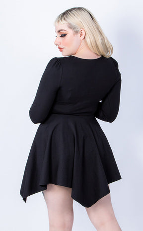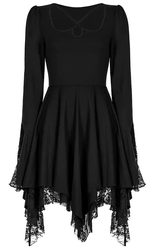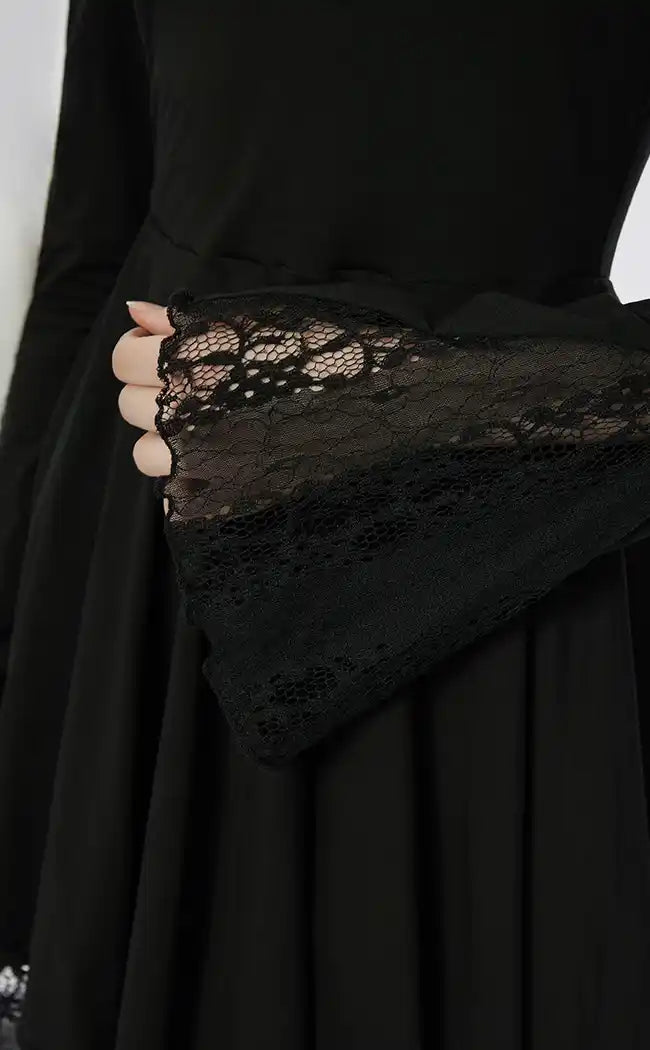 The Into Temptation Black Lace Dress is [perfect for a night out, or a night with your coven. It is witchy and dramatic, with flared sleeves that have black lace panels draping down over the wrists.