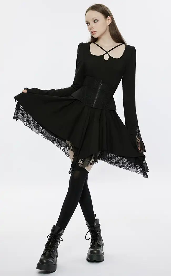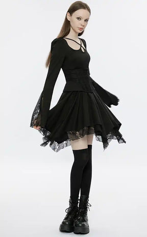 Made from soft, comfortable material, it flares at the waist to an asymmetrical handkerchief type hem which is finished with gothic black lace around the edge.