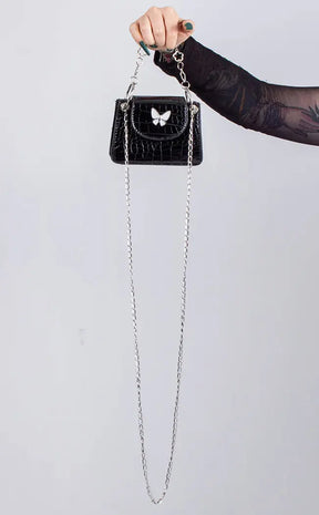 Embrace the tiny bag trend and go the extra mile with our Itsy Bitsy bags. The Chole is a gorgeous faux crocodile skin mini bag with a metal chain strap for carrying over the shoulder and a smaller metal flower chain for clutch carry. Both chains attach with oversized O rings on either side.