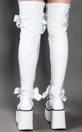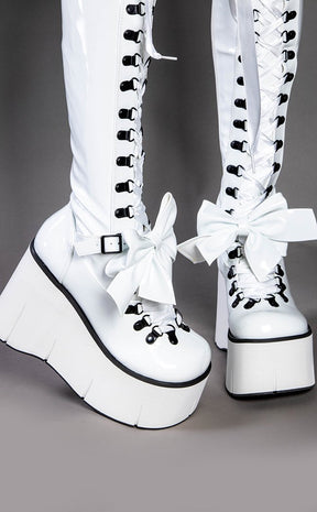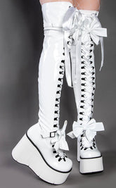Harajuku street style to the highest extreme. The KERA-303 boots are dramatic thigh-high boots decked out in adorable bows, all stacked on a platform wedge.