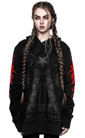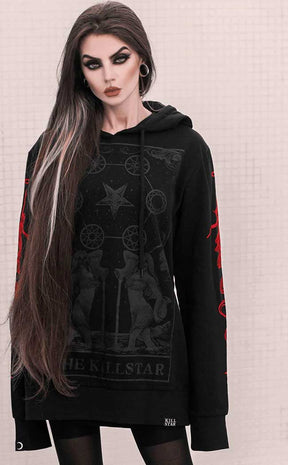 Find warmth in the darkness with the Killstar Oversized Hoodie! This super-soft jersey hoodie forms a relaxed fit with a large hood, a black-on-black print on the front and a contrasting red print on the sleeves.