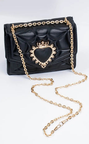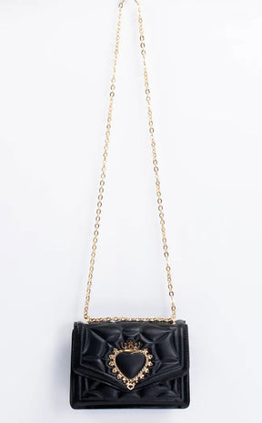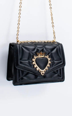 Greet the Labyrinth handbag, the dark, mysterious sister of the Divinity bag - featuring a spider web woven to create a tricksy pattern on the material and a darling gold heart crown.