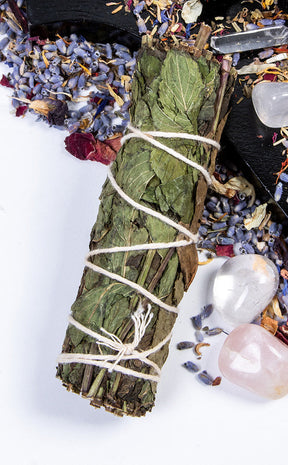 Lemon Balm is an ideal herb for Love, success, healing, and psychic/spiritual development. Peppermint's magickal properties are associated with healing, purification, psychic powers, sleep and love. This cleansing wand is a great alternative to white sage.