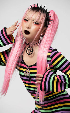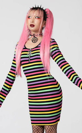 Keep yerself candy sweet in the Lick The Rainbow Ribbed Dress! Soft stretch cotton is ribbed for yer pleasure, forming this cute mini dress in all the colours of the goth rainbow. Super cute deets like the zipped scoop neckline, pentagram charm and subtle bell sleeves will have ya feeling like the tastiest piece of candy in the store.