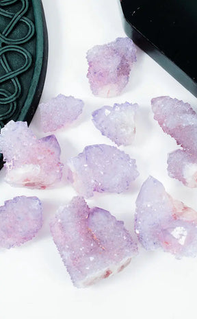 Spirit quartz, also known as fairy quartz or cactus quartz, is a unique variety of quartz that is formed in a specific way. Spirit quartz is formed in the fissures and crevices of rocks, particularly in areas with high levels of volcanic activity. As groundwater percolates through the rocks, it dissolves minerals such as quartz and amethyst and carries them with it. Spirit Quartz consists of a bigger main crystal point covered with tiny druzy crystals that look like glistening snow.