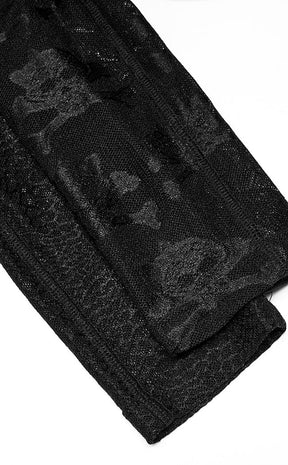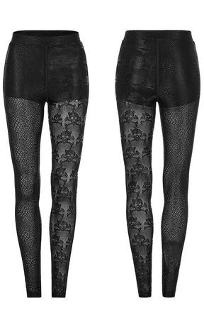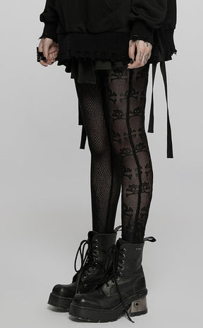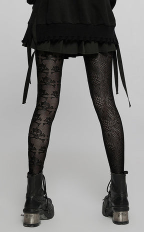 The emos rise again! The Little Crush Mesh Leggings are a super cute and versatile styling piece, made with soft stretch mesh featuring a skull print on one leg and an uneven fishnet pattern on the other.