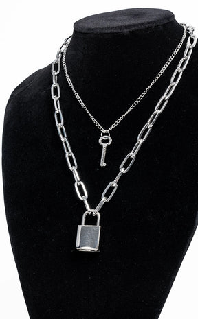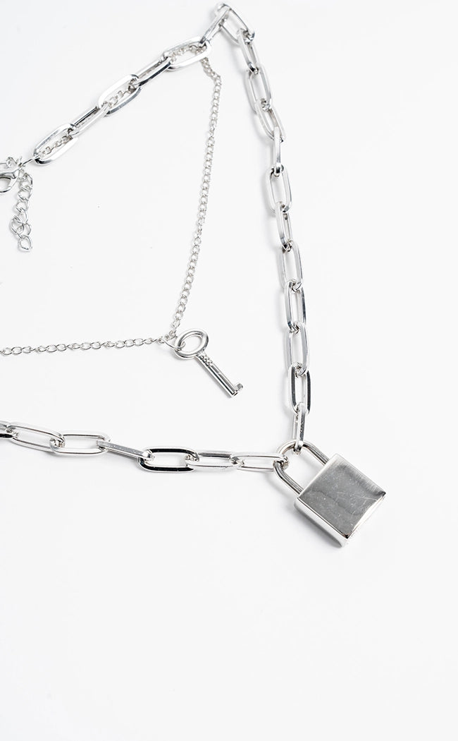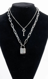 This bad-ass necklace features a chunky lockable padlock pendant on a thick chain and has a second chain with the key.