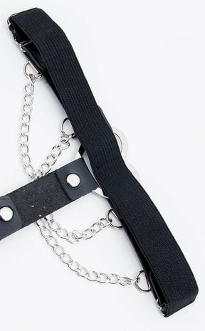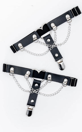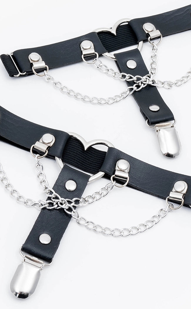 This black garter features a cutout heart in the centre and small silver chains dangling from black vegan leather material. The suspender straps come with clips to attach to stockings and the rear is elastic, adjustable for legs of all sizes.