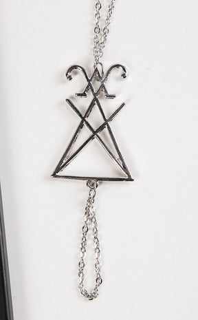 This striking bracelet connects to the finger with a delicate ring chain, a shining sigil of Lucifer sitting on the back of your hand.