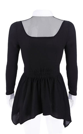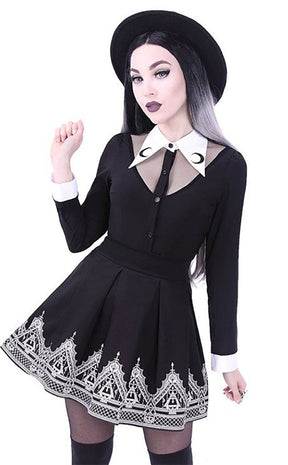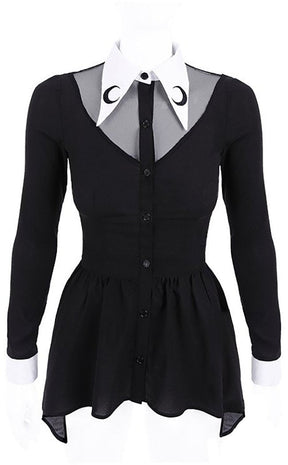 A crisp, white collar is embroidered with contrasting black crescent moons and sits over a mesh panel. The body of the top cinches at the waist and flares over to hips to flatter the figure, buttoning up in classic style. Perfect to wear over leggings for going out or impressing at the office.