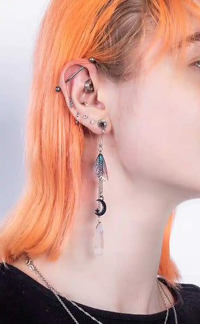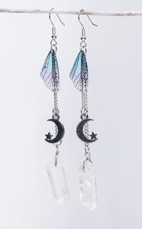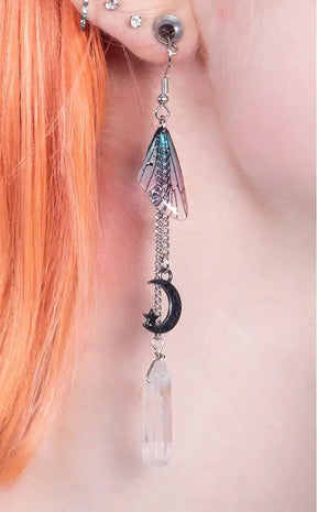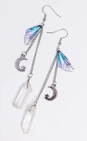 The perfect adornment for the forest fae. Each bewitching earring features a fairy wing in iridescent shades, a moon charm, and a clear quartz crystal on a chain.