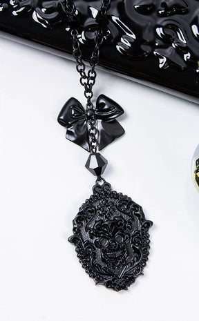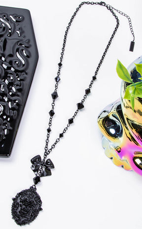 Always be funeral ready in the Madame Morte Necklace! The large yet lightweight cameo pendant is a stunning piece, hanging from a bow charm complete with a skull and filigree details. The long chain is patterned with matching black beads to add to the vintage look.