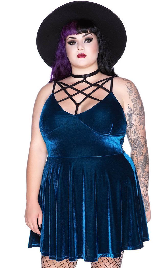 Perfect for casting spells of enchantment. This soft slinky and flowy dress is made from the softest stretch velvet. It gives you the perfect flattering shape with tapered waist and flowing skirt. Hexagram strappy neckline feature gives it that extra dash of magic. Wear at midnight.