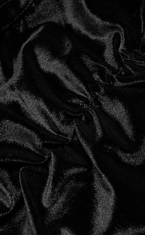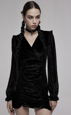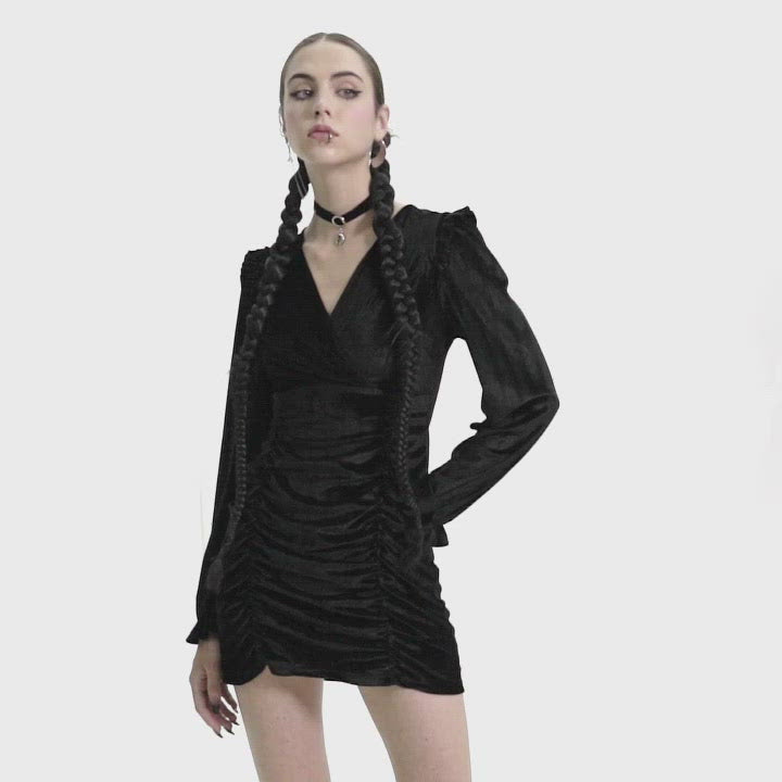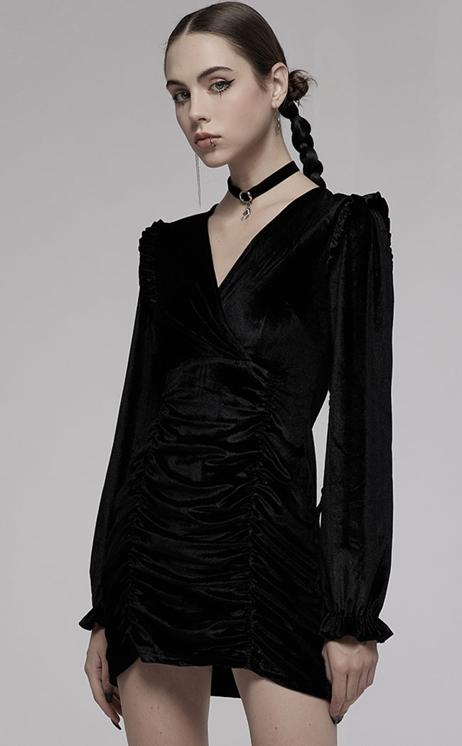 Dress to distress in the Malice Mini Dress! Soft, luxe velvet forms long sleeves with ruffled cuffs and shoulders. A deep V neck and ruched skirt create flattering lines, pairing with the fitted waistline to create the ultimate creepy-cute silhouette.