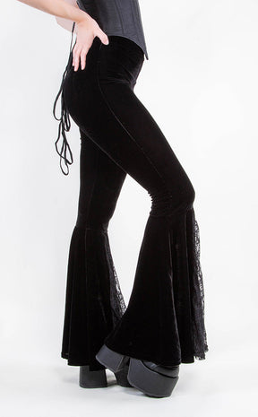 Look ghoulishly good in the Marison Velvet Bell Bottoms! Wickedly soft, pitch-black velvet hugs your legs, forming a high waist and super stretchy waistband for your comfort. The bell bottoms have an extra touch of drama with exxxquisite lace panels.