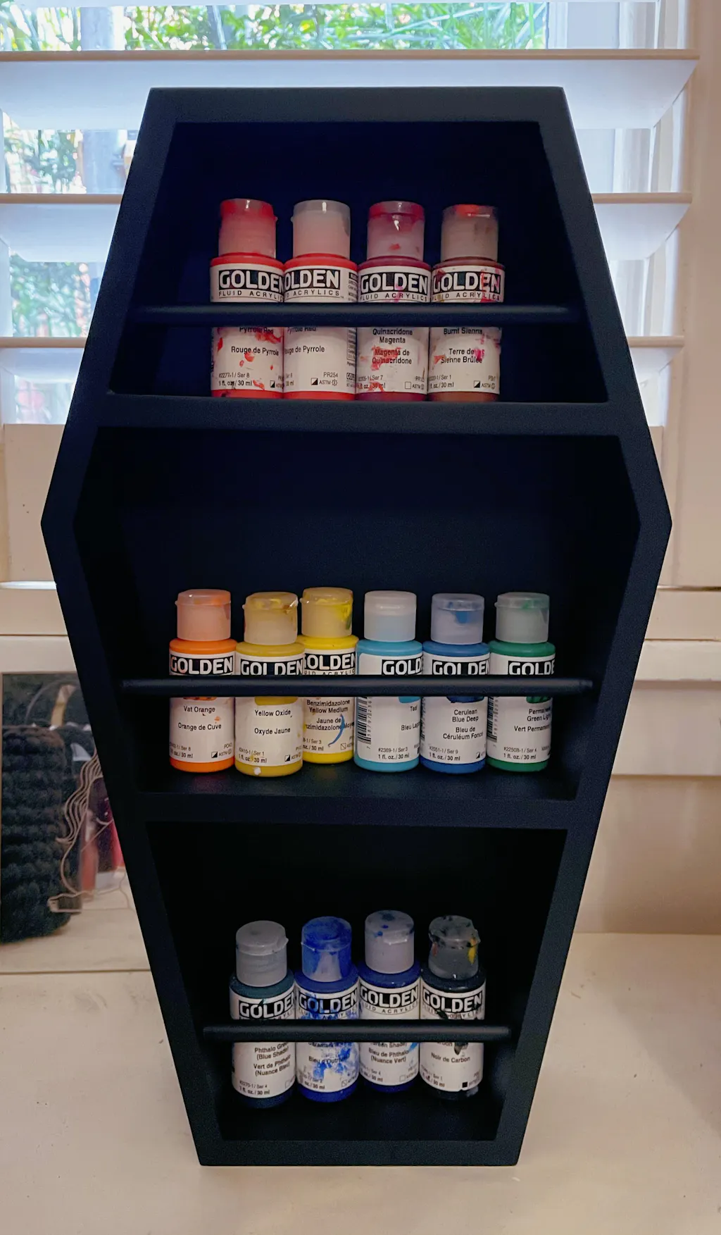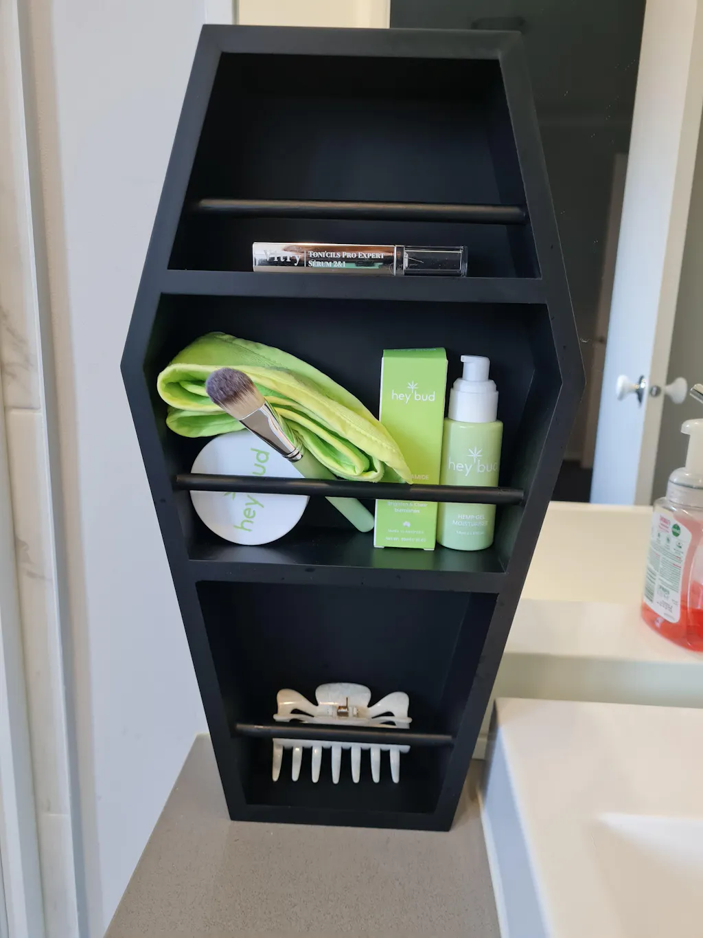 If you're a true lover of all things macabre, then the Mausoleum Organiser is the perfect addition to your makeup vanity! This coffin-shaped shelf is the ultimate way to keep your skincare, cosmetics and makeup organised and on display. With three compartments and a retaining bar on each shelf, your beloved products will stay upright and secure.
