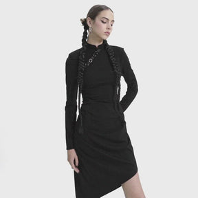 Show some fine lines and scandalous leg action in the Maxine Asymmetrical Dress. This warm midi dress is perfect for crisp winter outfits, featuring long sleeves, a Cheonsam style collar and slant buckle decal across the chest. The asymmetrical skirt gathers at the side to flatter the waist and create a flattering silhouette.