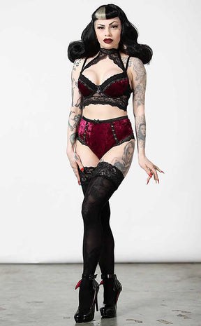 Dress to possess in the Mercy Lace Bra! Let the soft stretch velvet hug your body, trimmed with black lace and metal rivets for a touch of danger. The cups are lightly padded for extra support, connecting to a lace choker and adjustable shoulder straps.