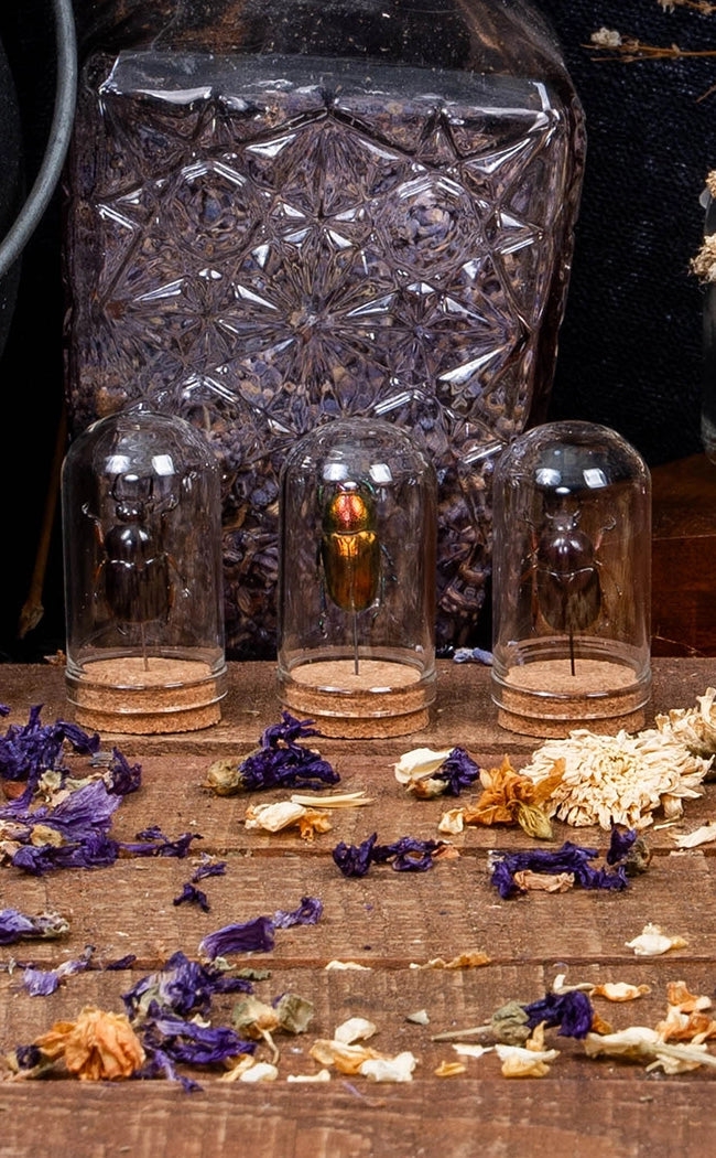 These genuine small beetles have been preserved, pinned into position, and then placed into a miniature glass dome on a taxidermy pin for display.
