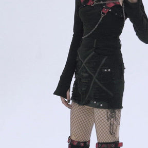 Get raw in the Enmity Denim Mini Skirt. The denim is shredded, featuring ragged edges and an inverted pentagram made of faux leather that cuts into the fabric. Extra details like studs and a final badass touch.