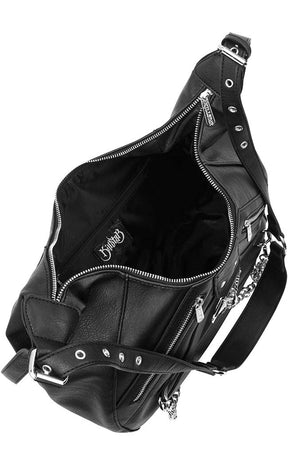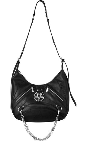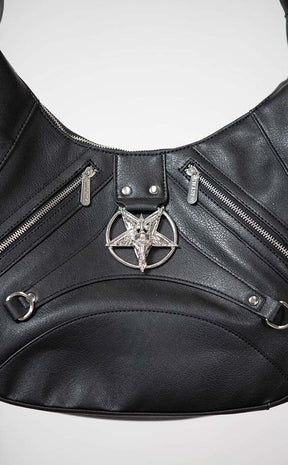 Kit up for a wild time with the Misfit Handbag! This badass handbag was crafted from luxe faux leather, featuring heavy metal deets like decorative zips, a detachable chain and a Baphomet pentagram. The main compartment is fully lined, securing with a zip and the shoulder strap is fully adjustable.