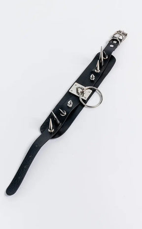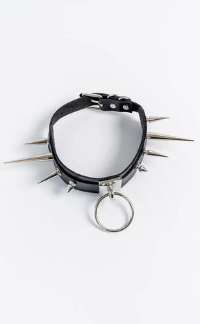 Introducing the Misfortune Spiked O-Ring Choker! It's adorned with 3 different-sized spikes and a metal O-ring in the centre. This choker looks great on its own and will surely have people begging to know where you got it from.