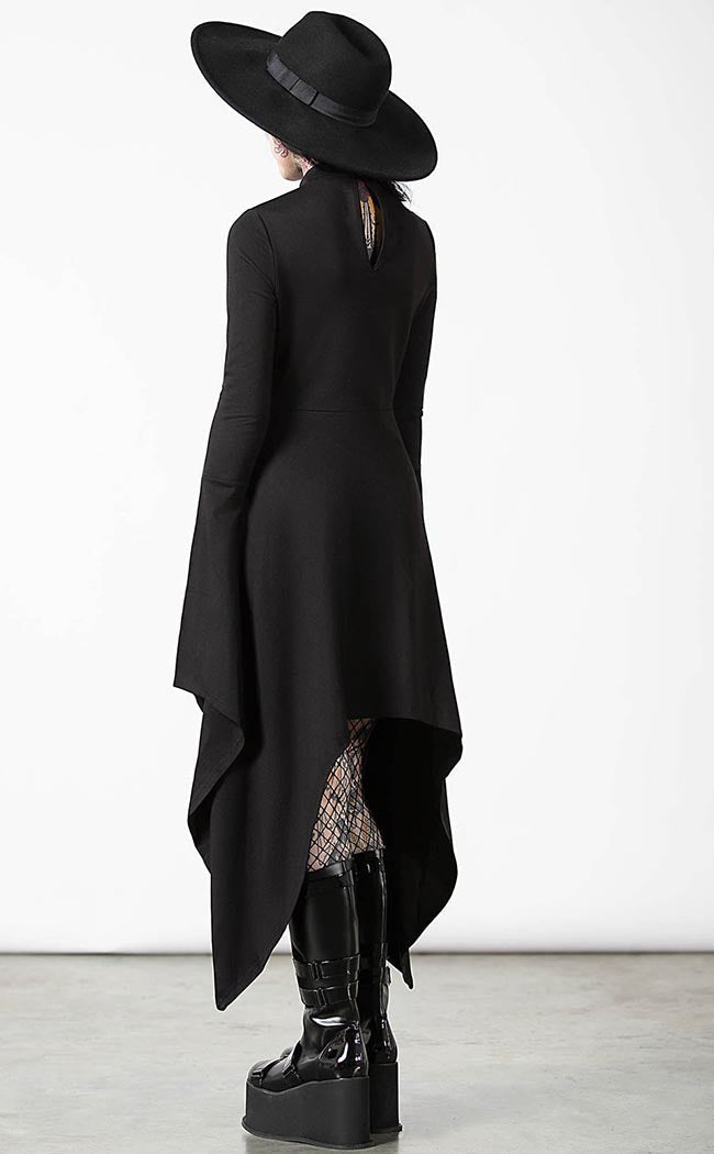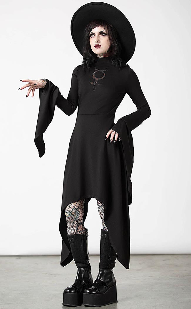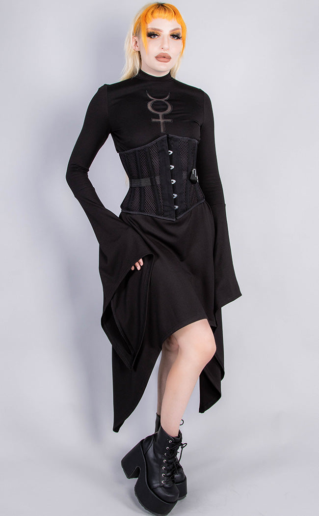 Go lunar wild with the Mistress Mercury Long Sleeve Dress! This witchy number was conjured from soft, flowing fabric that forms a fitted waist, high neck, hanky hem and dramatic bell sleeves. The chest has a statement Mercury glyph cutout that'll truly leave an impression.