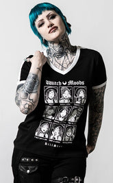 The witchy emotional spectrum, all on a handy dandy guide on this wicked v neck tee. The contrasting white print matches with the white bordering on the neckline and sleeves, making this baby super easy to mix n match with yer fave pants, skirts n jeans.