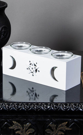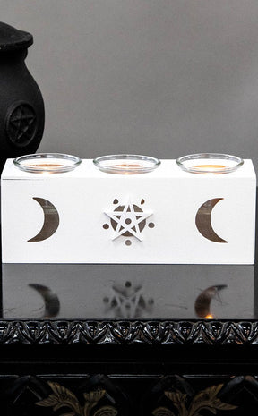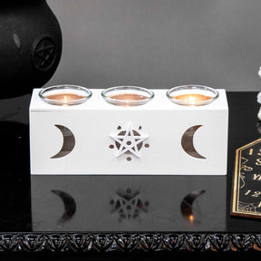 This beautiful candle holder features cutout details of moons and a star, lining up to form a triple moon symbol. The holder comes with 3 glass receptacles to hold standard-sized tealights.