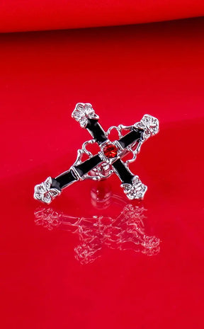 Crafted from surgical steel, this cross has a fiery red gem in the centre and is complemented with a sleek black enamel coating on the front.