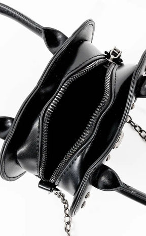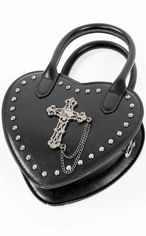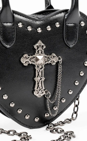 With its heart-shaped design and bold cross detail on the front, you'll be sure to make hearts race with envy with the Mortal Sins Heart Handbag. This bag adds a bit of punk to your look with cross and stud details at the front and a silver chain strap.
