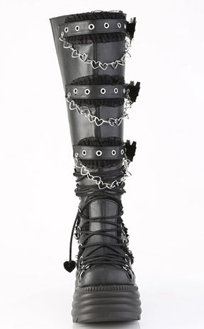 Be prepared to steal hearts with the MORTE-215s! Look like a total badass with these knee-highs decked-out in web heart buckles and heart chains.