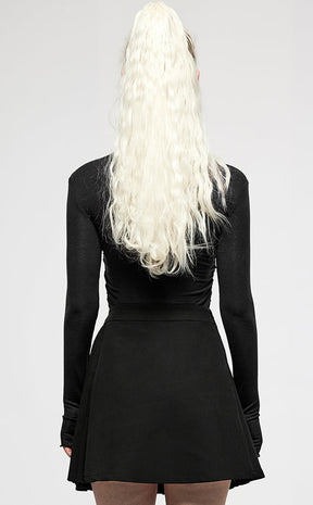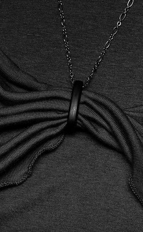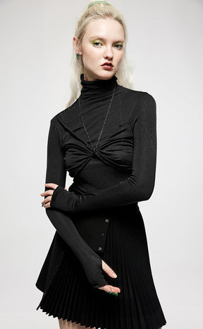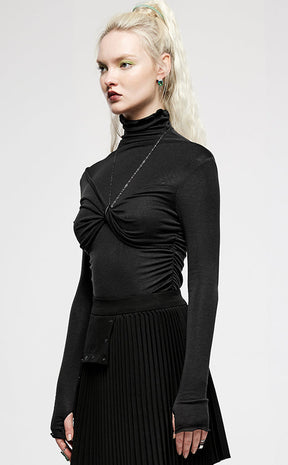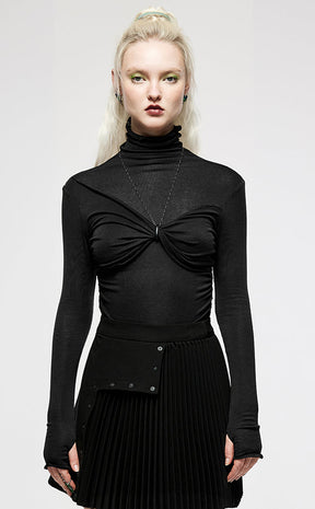 A wicked witch for the modern age! The Narcisse top is made with soft, stretch fabric that hugs yer bod with a high neckline and long sleeves complete with thumbholes. The front features an asymmetrical, gathered bow that secures with a rubber loop, connecting to a removable chain at the neck.