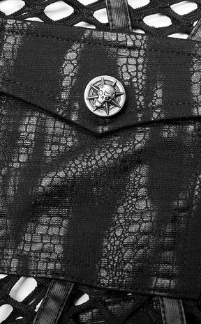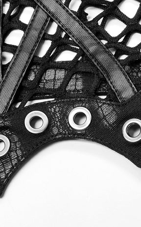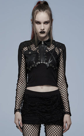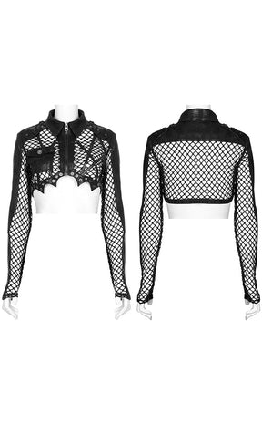 Command legions of the undead in the Noctura Cropped Jacket! Oozing gothic military vibes, this outfit finisher is conjured from a dramatic fishnet cut to a cropped batwing length. Faux leather deets stand out against the netting including a functional pocket, statement lines and a high collar. Silver hardware including eyelets along the hem polish off this evil piece for you to mix n match with yer fave tops n dresses!