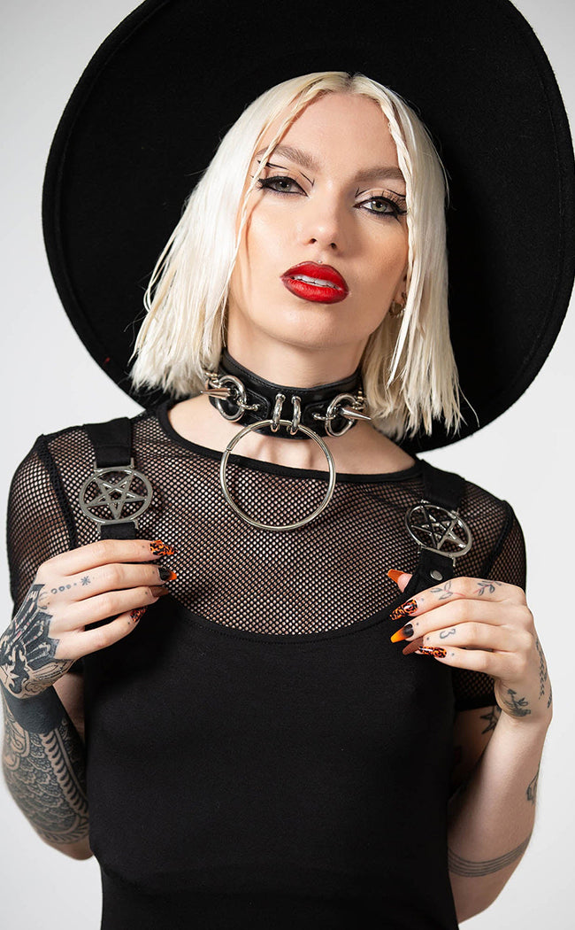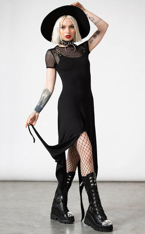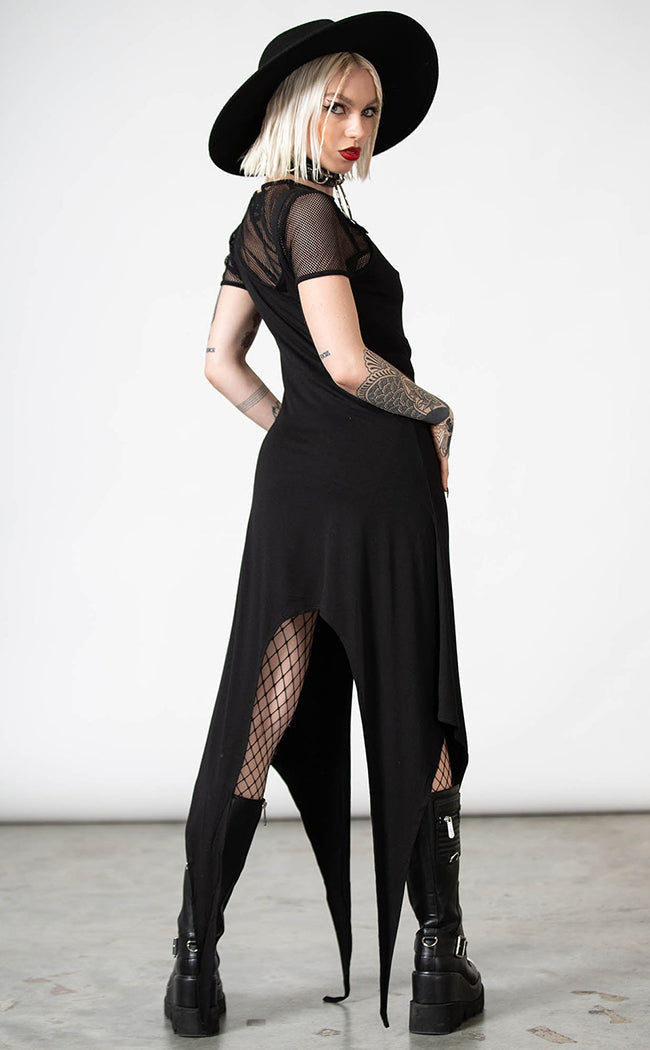 Put a hex in yer step with the Noctura Hanky Panky Dress! Super stretch fabric flows around yer ankles in a dramatic hanky hem, moving like tendrils of shadow as you walk. The shoulder straps are cut with pentagram charms to add a flash of metal, creating a versatile styling piece that you can dress up or down in a snap.