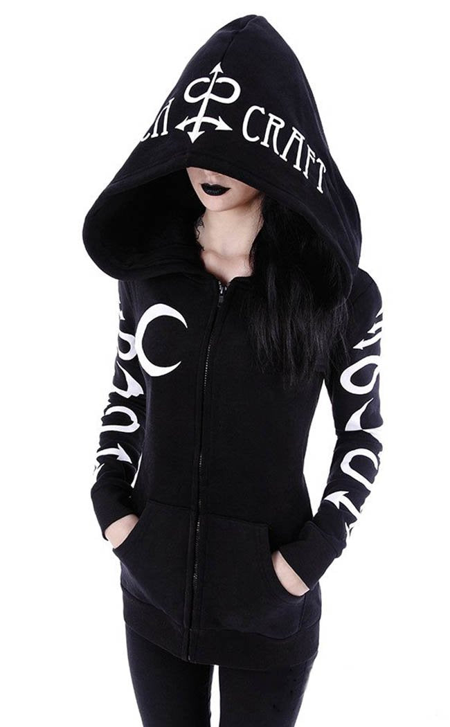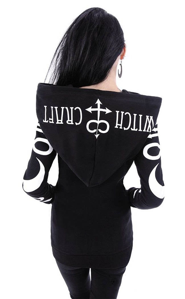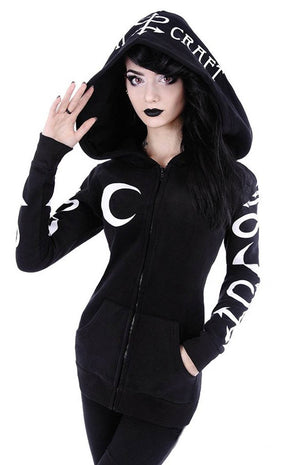 Sprinkle a little witchcraft into your winter wardrobe. The sleeves are covered with bold, white alchemical symbols, a crescent moon on the breast. The hood is massive and printed with Witchcraft.