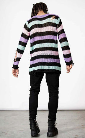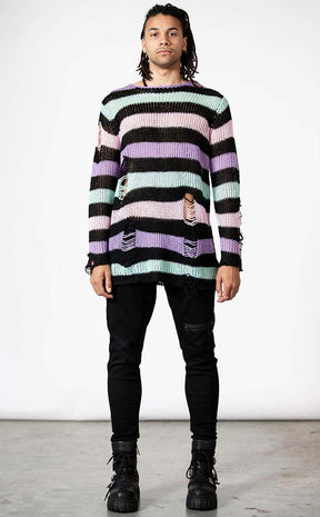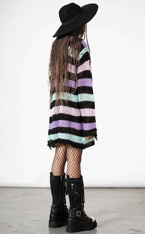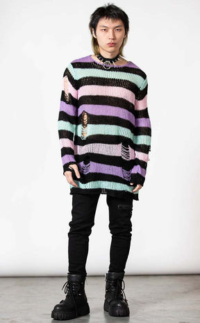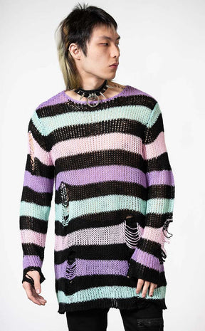 Bring out yer cotton candy rebel in the Pastel Punk Knit Sweater! This super soft knit falls over yer bod just right, featuring a relaxed fit, distressed deets, a long hemline and boost contrasting stripes.