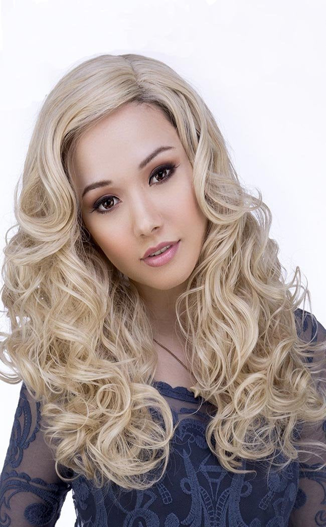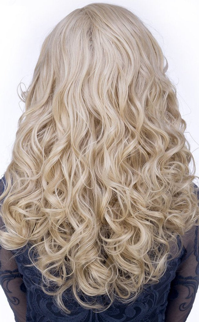Gorgeous light blonde lace front wig with natural waves and great volume. Looks stunning!