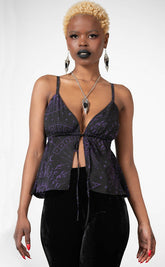 Flow with the whims of the wind in the Pendant Chiffon Top! Soft, lightly stretchy black mesh is printed with a custom celestial print to have ya feeling like a lunar goddess. This forms a statement split tank design with padded cups, a drawstring closure and adjustable straps.