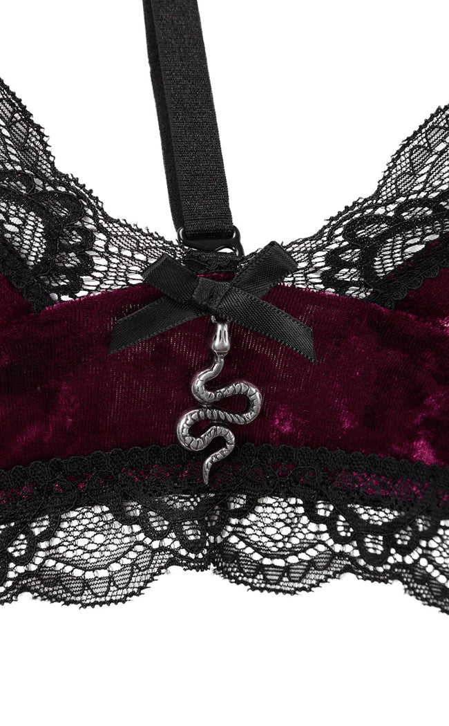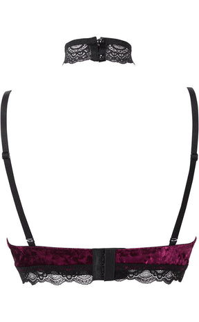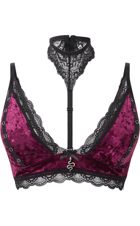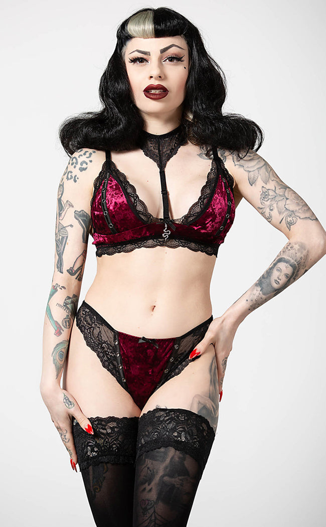 Dare to be devilish in the Pin Stuck Bra! Crafted from soft stretch velvet, this bra loves your curves, trimmed with black lace and metal rivets. A detachable lace collar adds an xxxtra layer of versatility so you can feel your fave flavour of sexy.