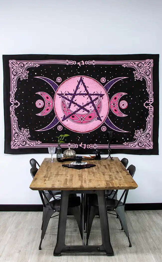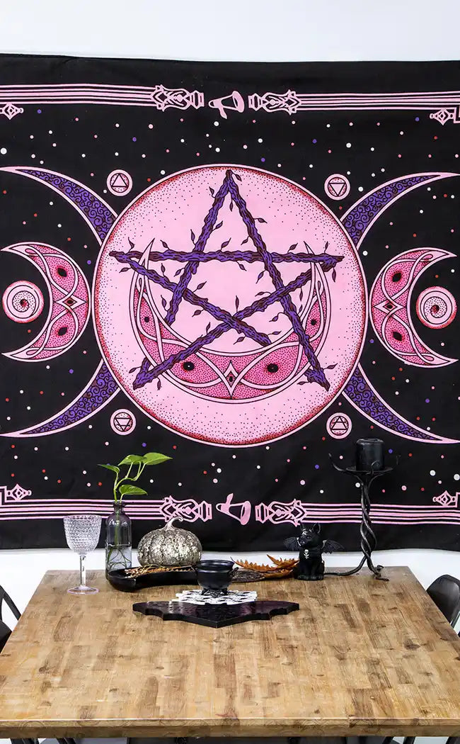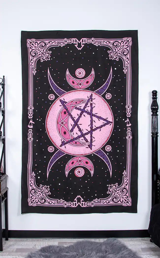 This tapestry features pastel pink and purple details including a triple goddess pentagram symbol, intricate filigree border and elemental symbols. The pastel hues contrast with the all-black background dotted with stars.