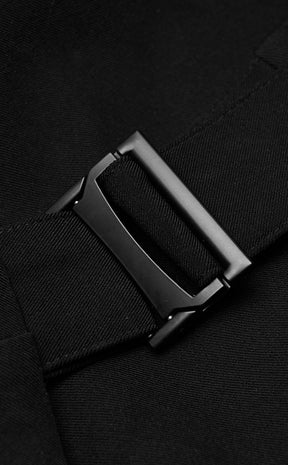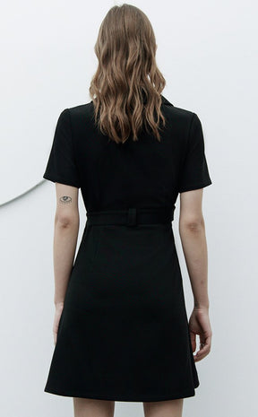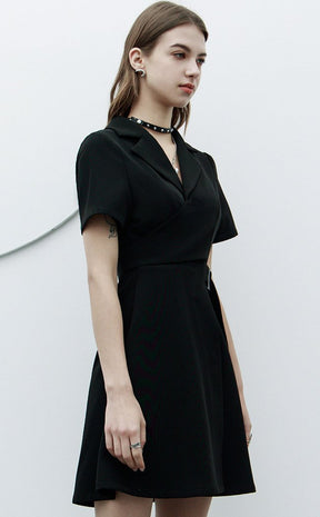 Get yourself lookin' chic in threads as black as your soul! This blazer-look minidress has a slick collar, short sleeves and a v neck chest that secures with a buckle.
