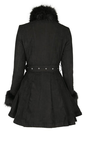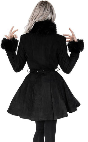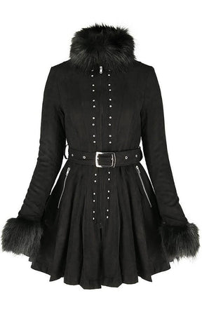 Cut from soft vegan suede, the collar and sleeves are trimmed in faux fur for classic glamour while the front zip fastening is surrounded by studs. The coat cinches at the waist with a belt and flares with pleats to create a gorgeous feminine silhouette.