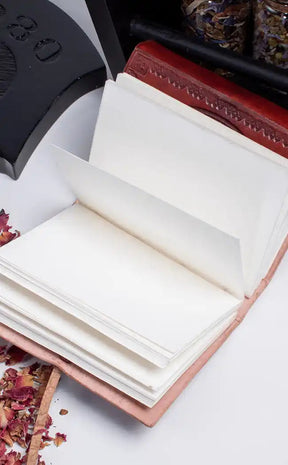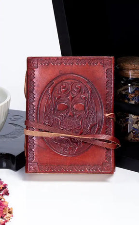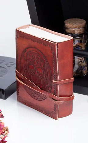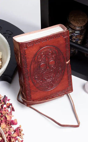 Begin your own book of shadows with this magical leather grimoire! The cover is embossed with a skull and elaborate bordering on a brown aged leather cover. It secures with a wraparound tie to keep your writings safe and sound.