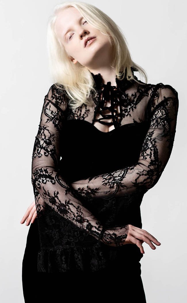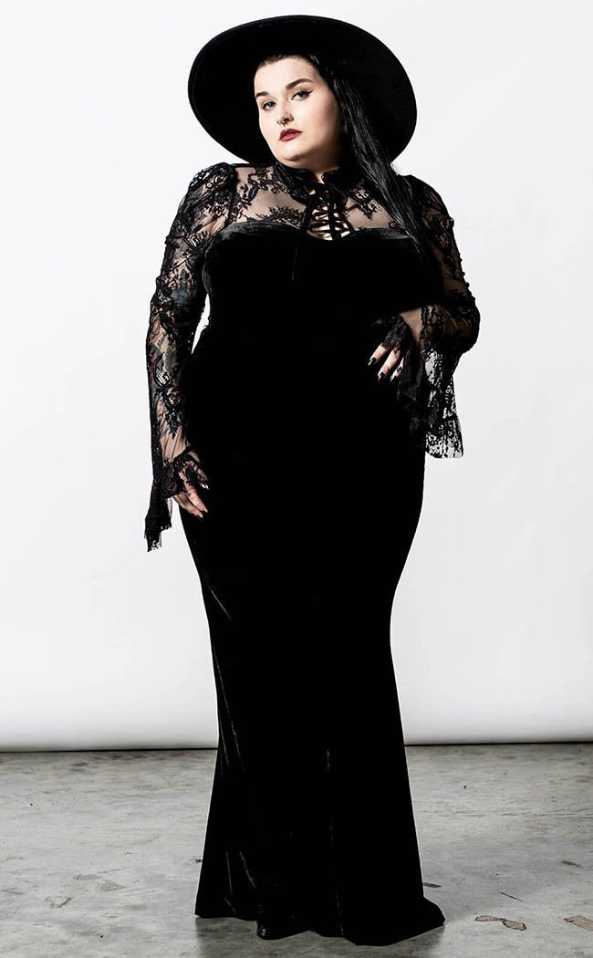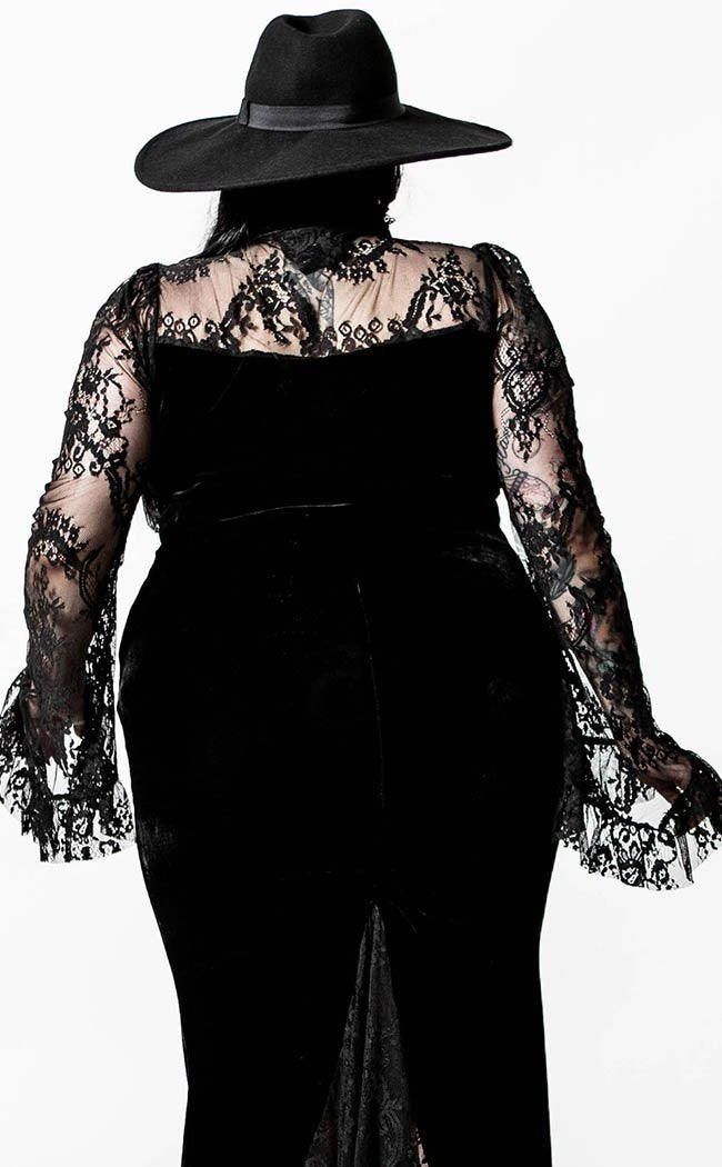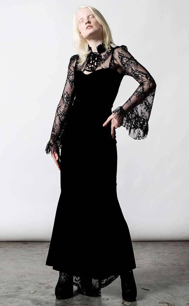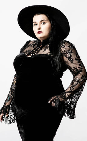 Haunt their dreams in velvet and lace. The Poison Fang Long Sleeve top stretches comfortably to worship your body, the soft-touch velvet body fitted to flatter your curves. The lace upper features a statement lace-up yoke and bell sleeves ending in ruffles.