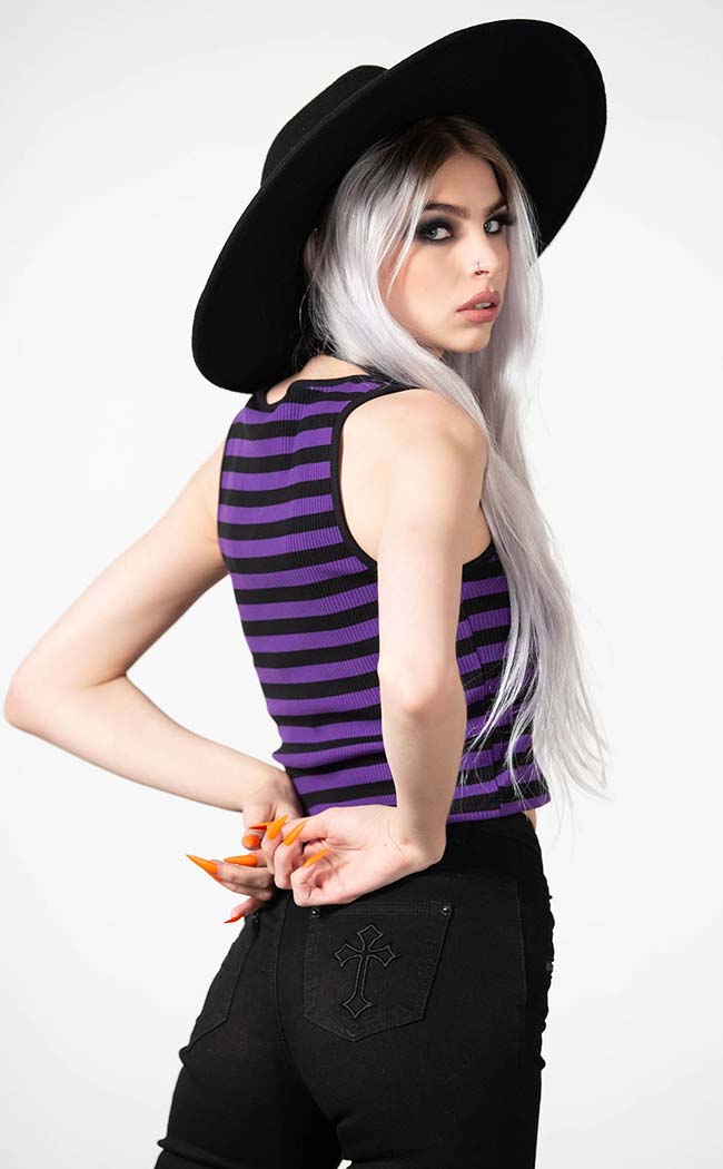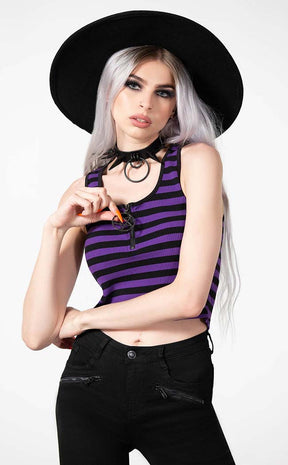 Break up the basics with the Possessed Rib Vest! This cropped cutie is made from a soft, stretch ribbed fabric, featuring contrasting stripes and a chunky pentagram zip on the round neckline.